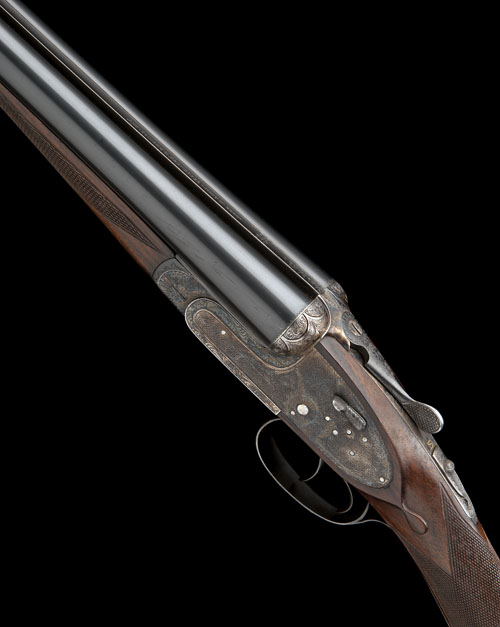 28in. nitro chopperlump barrels, 2 3/4in. chambers, bored approx. true cyl. in both, some pitting, engraved arcaded fences, removable striker discs, automatic safety, hand-detachable lockplates, gold-inlaid cocking-indicators, articulated front trigger, rolled-edge triggerguard, acanthus scroll engraving, retaining some original colour-hardening and finish, 14 3/4in. stock, weight 6lb. 5oz.