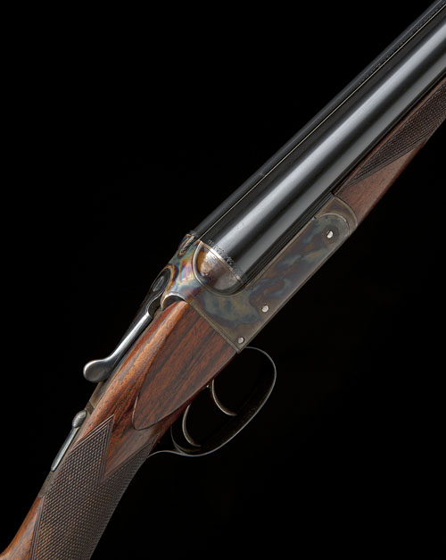 28in. nitro reproved barrels (in 2012), rib engraved 'WESTLEY RICHARDS & CO. LONDON.', 2 1/2in. chambers, bored approx. 1/4 and full choke, treble-grip action, automatic safety with blued 'SAFE' detail, border engraving, retaining much colour-hardening and finish, 15 1/4in. figured stock including 2in. wooden extension, fore-end with Deeley and Edge patent release and horn finial, weight 5lb. 14oz.