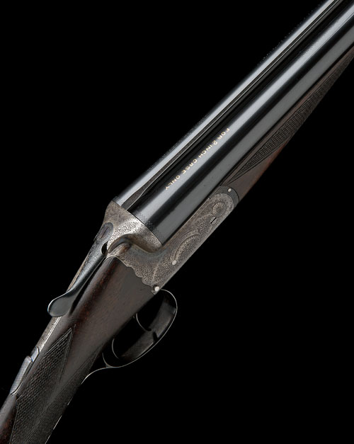 27in. nitro reproved barrels with matt Churchill-rib, the right barrel gold-inlaid 'FOR 2 INCH CASE ONLY', and engraved 'J. GRAHAM & CO. LTD.', the left barrel engraved '26 UNION STREET. INVERNESS. THE 20TH CENTURY GUN.' (right wall thickness below recommended minimum), 2in. chambers, bored approx. imp. cyl. and full choke, scroll-back action, automatic safety, fine border and scroll engraving, the makers name in a scrolling banner, retaining some colour-hardening and finish, 14 3/4in. stock including 1 3/8in. wooden extension, weight 4lb. 14oz., in a leather case