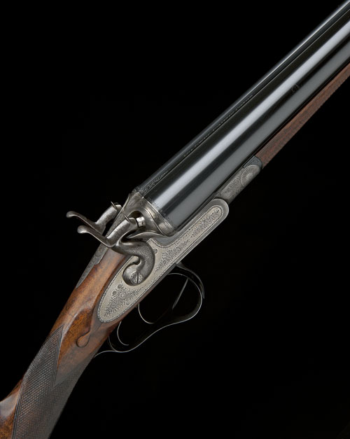 30in. nitro barrels, rib engraved (refreshed) 'THOS. JOHNSON. SWAFFHAM. NORFOLK.'. 2 1/2in. chambers, bored approx. true cyl. and 1/2 choke, carved percussion fences, rebounding sidelocks, fine border and scroll engraving, brushed bright and reblued finish overall, 14 1/4in. figured stock including horn buttplate, weight 6lb. 15oz.