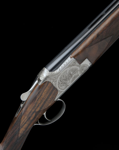 26 3/8in. (67cm) nitro barrels with 5mm ventilated matt top-rib, 2 1/2in. chambers, bored approx. imp. cyl. and 1/2 choke, hold-open toplever, manual safety with integral barrel selector switch, bold scroll engraving with game scenes of pheasant and duck, signed 'M. DERWA', bright finish, 14 1/4in. boldly-figured stock including buttplate, weight 6lb. 5oz.