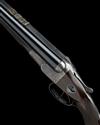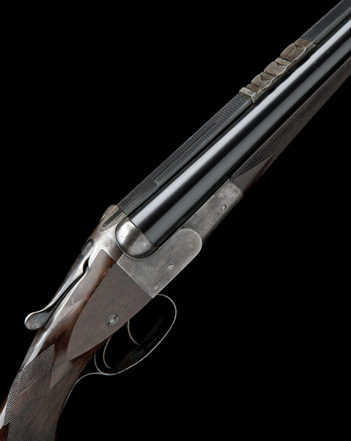 24 1/4in. lined nitro reproved barrels with broad raised matt rib, banner engraved 'W. W. GREENER. 68. HAYMARKET. LONDON.' three folding leaf sights for 300, 450 and 600 yards, replaced ramp-mounted bead fore-sight, right barrel engraved 'GREENER'S WROUGHT STEEL', treble-grip action, manual side-safety with gold-inlaid 'SAFE' detail, plain finish, retaining traces of original finish, 13 3/4in. pistolgrip stock (cracked through and repaired at hand) with cheekpiece, horn pistolgrip-cap, sling swivels and steel buttplate (with trap), weight approx. 9lb. 1oz.