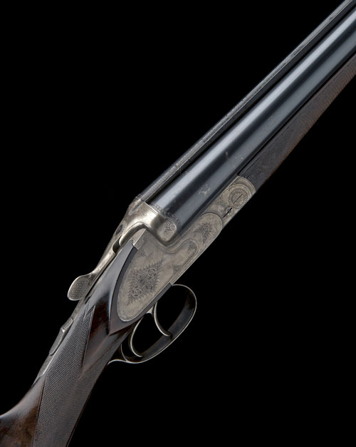 27 1/2in. nitro reproved barrels with matt rib engraved 'GENOSS. d. BUSCHENMACHER IN FERLACH', 2 1/2in. chambers, bored approx. true cyl. and 3/4 choke, treble-grip action with sideclips, automatic safety, the action and decorative sideplates with border and partial scroll engraving, retaining traces of original colour-hardening and finish, 14 1/2in. stock with border engraved steel heel and toe plates, weight 6lb. 9oz., together with original bill of sale, dated 27.12.45 made out to Herrn Leutnant T.J.C. Washington