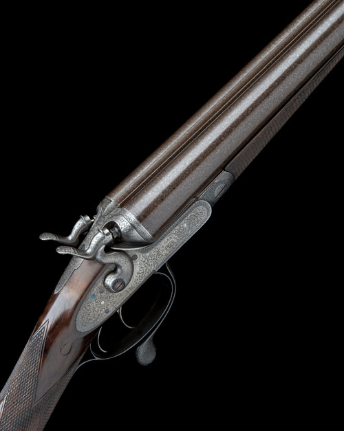 30in. nitro reproved damascus chopperlump barrels, fine scroll engraving at the breech ends, rib engraved 'R.S. GARDEN. 29. PICCADILLY. LONDON.', 2 3/4in. chambers, bored approx. true cyl. in both, Jones patent rotary-underlever, carved percussion fences, rebounding sidelocks with dolphin hammers, best bold acanthus scroll engraving with beaded and ropework borders, bright and blued finish, 14 1/4in. well-figured stock including horn buttplate, fore-end with scalloped horn finial converted to snap-fitting from crosspin release, weight 6lb. 14oz.