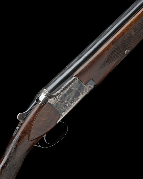 27 1/2in. nitro barrels with 6mm ventilated matt top-rib, 2 3/4in. chambers, bored approx. 1/4 and full choke, hold-open toplever, manual safety with integral barrel selector switch, border engraving, retaining some renewed colour-hardening and finish, 14in. stock, weight 6lb. 9oz., in a case