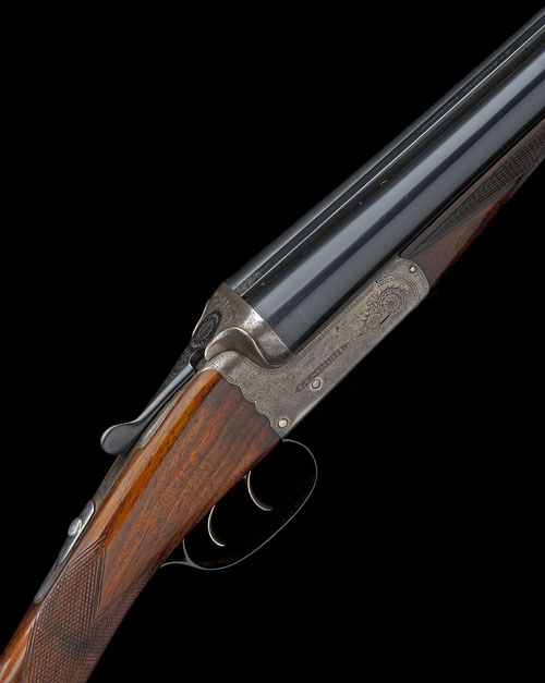 27in. nitro barrels, rib engraved 'K.D. RADCLIFFE. COLCHESTER.', internally pitted, 2 1/2in. chambers, bored approx. imp. cyl. and 1/4 choke, carved fences, scroll-back action, automatic safety with gold-inlaid 'SAFE' detail, beaded border engraving, retaining very slight traces of original colour-hardening, 14 3/4in. stock, weight 5lb. 10oz.