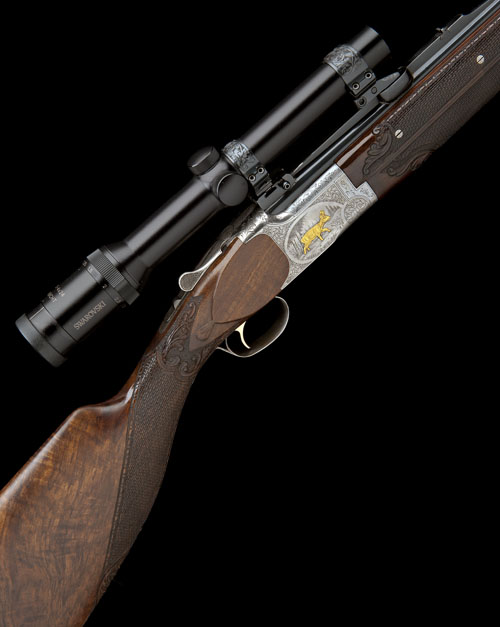 23 5/8in. (60cm) nitro barrels with matt sight rib, open sights and ramp-mounted high-visibility fore-sight, the breech end mounted with a Swarovski Habicht 1,25-4x24 telescopic sight in quickly-detachable mounts, hold-open toplever, manual safety with integral barrel selector switch, gold-washed trigger, acanthus scroll engraving surrounding relief engraved and gold-inlaid game scenes of stag and roe buck, the underside with the head of a wild boar, bright finish, 14 3/4in. well-figured roachbelly stock with carved acanthus details and beaded bordering, the fore-end with dummy screws and carved to appear a three piece, weight 9lb. 1oz.