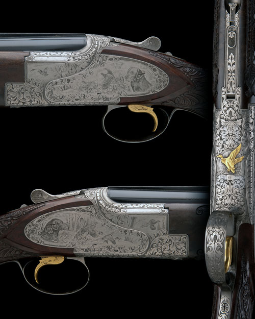 28in. nitro barrels with 7mm ventilated matt top-rib, bored approx. imp. cyl choke in both, hold-open toplever, manual safety with integral barrel selector switch, gold-washed single trigger, action and decorative sideplates carved with scrolling acanthus and leaf motifs, surrounding game scenes of hound and fowl, the triggerplate signed 'C.PERFIDO', the underside relief engraved and gold-inlaid with a mallard alighting, with a banner engraved 'ONE OF ONE', 14 1/8in. highly-figured sunburst pistolgrip stock with ornately carved chequering borders and including 5/8in. wooden buttplate, the fore-end decorated en suite, weight 7lb. 4oz.