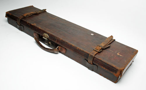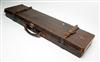 A SINGLE LEATHER GUNCASE, suitable for 30in. barrels, lined with green baize, brass lock (key missing), the interior lid with a leather gold tooled 'HOOTON & JONES' trade label
