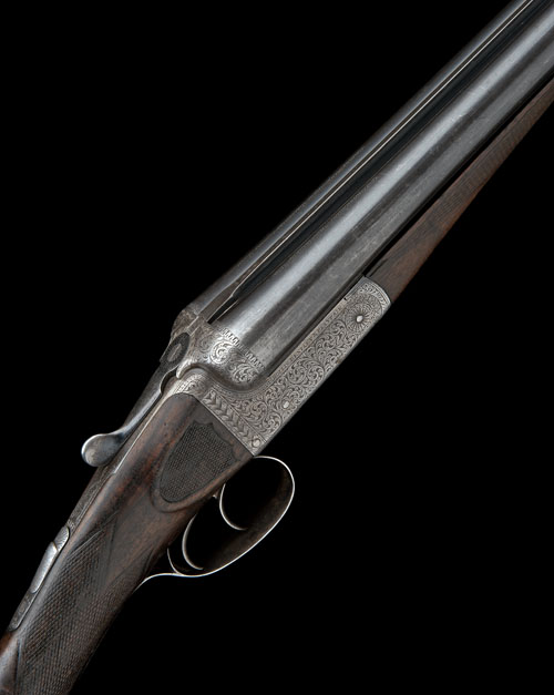 25in. replacement nitro barrels with matt Churchill-rib, gold-inlaid 'XXV' at the breech end, tubes engraved 'E.J. CHURCHILL (GUNMAKERS) LTD. ORANGE ST. GUNWORKS. LEICESTER SQUARE. LONDON.', some pitting, 2 1/2in. chambers, bored approx. 1/4 and 3/4 choke, treble-grip action, automatic safety with silver-inlaid 'SAFE' detail, profusely engraved with bold acanthus scrolls with beaded and feathered borders, brushed finish overall, 14 5/8in. stock with chequered recessed side panels and including 1 1/8in. extension / rubber recoil pad, weight 6lb. 4oz.