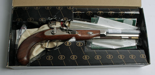 A REPRODUCTION .45 FLINTLOCK SINGLE-SHOT TARGET PISTOL SIGNED PEDERSOLI, MODEL 'CHARLES MOORE', serial no. 88401, with stainless steel octagonal 11in. barrel, dove-tailed front and rear-sights, plain lock and walnut half-stock with chequered bag-shaped butt, complete with its makers card carton, appearing little used