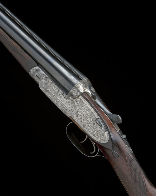 26 3/4in. (68cm) nitro reproved chopperlump barrels, 2 3/4in. chambers, bored approx. imp. cyl. and 1/4 choke, removable striker discs, automatic safety, hand-detachable lockplates, gold-inlaid cocking-indicators, acanthus scroll engraving, brushed bright finish, 14 1/4in. stock (repair at left underhorn) including 1in. rubber recoil pad, weight 5lb. 10oz.
