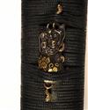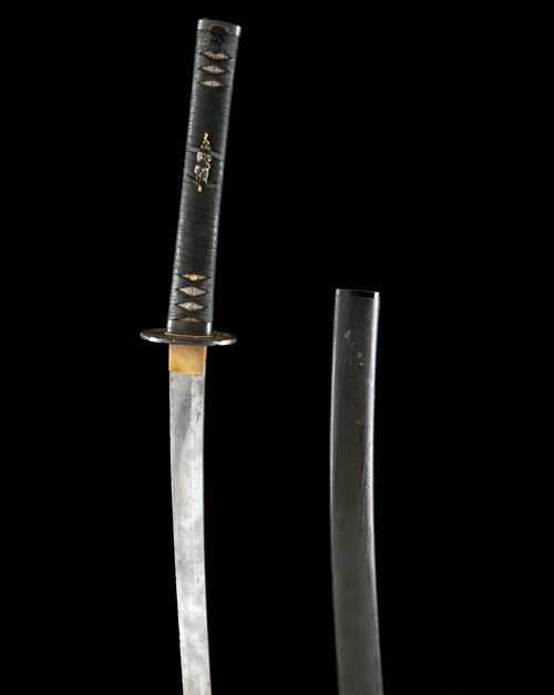 possibly 15th century, the curved 27 1/2in. blade signed on the tang, translated 'BIEN OSAJURE KAGEMITSU' (1324-1428), traces of 'hamon', the edge in poor condition, the fittings mostly 18th century with a slightly earlier iron tsuba carved and inlaid with precious metals, TOGETHER WITH a black laquered 'saya'