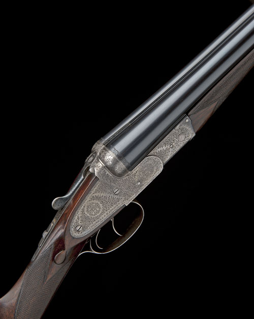 27 3/4in. shortened nitro barrels, rib engraved 'COGSWELL & HARRISON. 168. PICCADILLY. LONDON.', 2 1/2in. chambers, bored approx. true cyl. in both, carved fences, automatic safety with gold-inlaid 'SAFE' detail, stepped action and decorative sideplates with bouquet and scroll engraving, brushed bright finish overall, 14 7/8in. boldly-figured stock including 7/8in. rubber recoil pad, weight 6lb. 9oz.