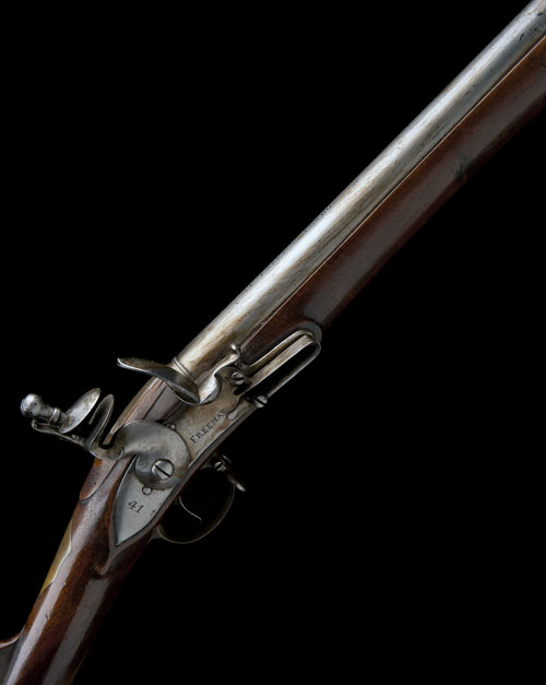 circa 1760, with 46in. barrel, block fore-sight, the top at breech signed 'FREEMAN, LONDON' together with the number '41', dove-tail style top-tang, strongly curved and radiused lock signed 'FREEMAN' forwards of the hammer and '41' on the tail, unbridled frizzen, handrail-style three-quarter stock (some isolated worm) inlet with a brass shield escutcheon at the wrist engraved 'M' over '41', all brass furniture including serpentine side-plate, four ramrod pipes including throat and original iron ramrod, all iron surfaces cleaned and 'in the white' with some mild staining, London proofs