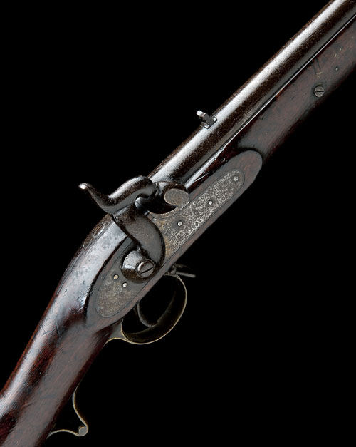 dated for 1844, with 20in. round barrel, applied fore-sight, standing leaf rear-sight, border-lined lock signed and dated 'TOWER 1844' together with a 'VR' crown cypher, walnut full-stock stamped with an illegible suppliers name to the underside near toe, brass furniture including pistol-gripped trigger-guard stamped 'N68', long iron varient saddle-bar with extension fixed with a wood-screw, one ramrod pipe (missing stirrup and captive ramrod), iron surfaces lightly corroded