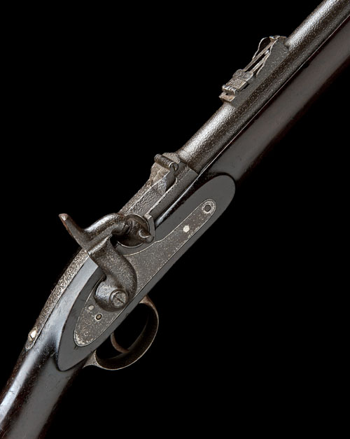 being a conversion from muzzle-loading circa 1855, with 30 1/2in. barrel, block and blade fore-sight, elevating ladder rear-sight, hinged trapdoor action, the breech-block with recess for combustible cartridge and replaceable obturator, the base signed 'FRANZ KNOEFERL, LONDON' in gothic script, flat, border line engraved lock adapted from the military pattern, walnut three-quarter stock with iron furniture, two barrel bands, exposed iron surfaces pitted, some deep, the trigger guard bearing an old Wallis & Wallis auction label