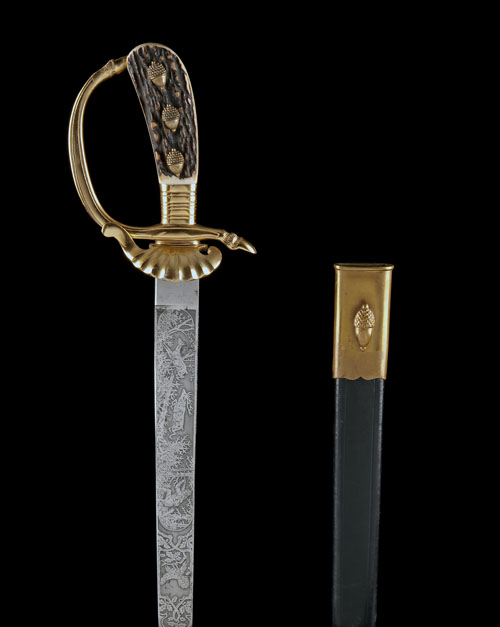 with 13in. spear-point blade, false edged for the last 4in., both sides of the blade etched with woodland hunting scenes, the ricasso stamped 'ORIGINAL EICKHORN, SOLINGEN' together with a squirrel trademark, gilded 'D'-shaped hilt with shell-guard and border-lined knuckle-bow, deer-foot terminal to the quillion, staghorn scales each with three applied acorn motifs (gilding worn on acorns, minor scuffs to shell, blade with slight stains) TOGETHER WITH its brass-mounted black leather sheath, the mounts correctly stapled, the throat with 'acorn' frog button.