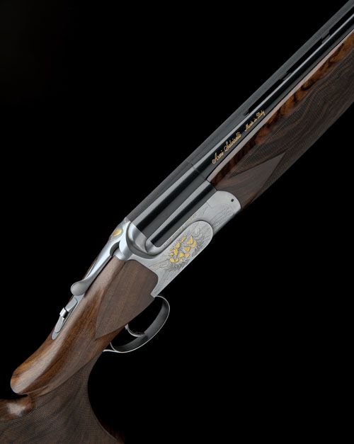 30in. nitro barrels with ventilated mid-rib and 10mm ventilated matt top-rib, 3in. chambers, multichokes (with spares), hold-open toplever gold-inlaid with a clay target, manual safety with integral barrel selector switch, pierced trigger, chrome action gold-inlaid 'LONDON 2012' and with a gold-highlighted 'busted' clay target, bright finish, 14 3/4in. figured pistolgrip stock with ergonomically sculpted thumb stop, weight 7lb. 12oz., in its makers universal case