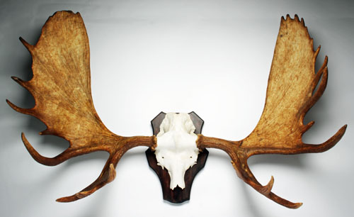A FINE SKULL MOUNT OF A MOOSE, mounted on a wooden plaque Estimate £400-600