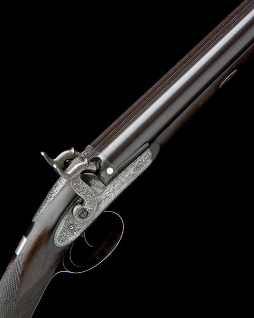 circa 1845, with browned 30in. barrels, the top-rib signed 'ROBERTSON' (remainder illegible), shell engraving to top of breech, platinum plugs, scroll-engraved broad top-tang, border, scroll and game-scene engraved bar-action locks signed 'ROBERTSON', scroll engraved dolphin-headed hammers, walnut half-stock chequered at the wrist, scroll engraved iron furniture with a dog engraved to the trigger-guard bow, ball and feather finial, pineapple finial to the ramrod throat and original rammer (tip detached but present), the whole refinished