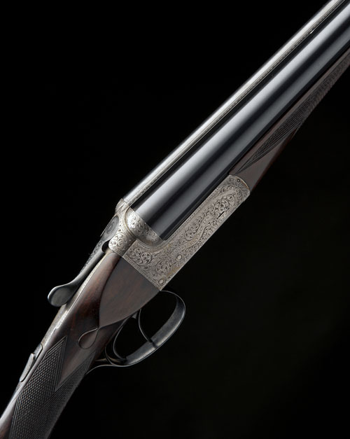 28in. nitro barrels, rib engraved 'W.J. JEFFERY & CO. LTD. 9. GOLDEN SQUARE. REGENT STREET. LONDON.', 2 1/2in. chambers, bored approx. true cyl. and 3/4 choke, some internal pits, treble-grip action, automatic safety, beaded border and bold scroll engraving, brushed and blued finish overall, 14 5/8in. figured stock including 1in. wooden extension and 3/4in. rubber recoil pad, weight 5lb. 14oz., in a brass-cornered canvas and leather case with some accessories