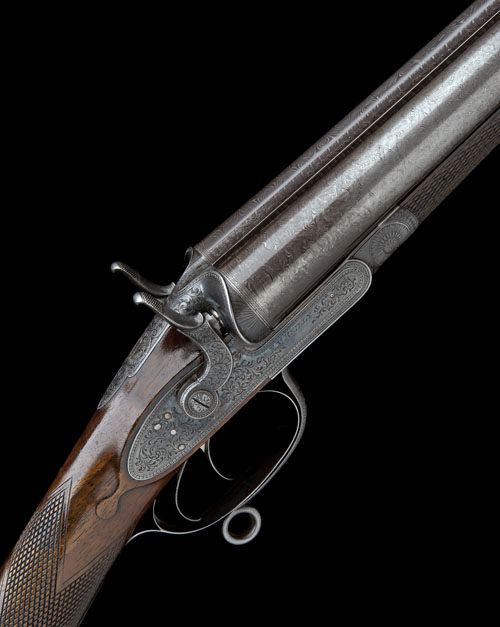 30in. black powder only bold damascus barrels, rib engraved 'E.M. REILLY & CO. NEW OXFORD STREET. LONDON.' 2 1/2in. chambers, bored approx. imp. cyl. and true cyl. choke, Jones patent rotary-underlever, carved serpentine fences with feathered detailing, non-rebounding sidelocks with hammers of hare's-ear form, ropework and beaded border engraving with bold acanthus scrolls, retaining some colour-hardening and finish, 14 1/2in. boldly-figured stock including horn buttplate, weight 6lb. 12oz.