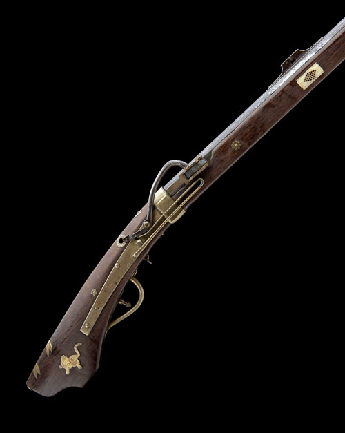 Japanese, late Edo period, with tapering 42in. octagonal iron barrel with swollen muzzle, defined top 'rib', ramp fore-sight, raised groove fixed rear-sight, brass barrel retaining band at breech, swinging brass pan-cover, plain elongated brass lockplate with large external brass mainspring, hand-cocked serpentine match-holder, wooded full-stock of classic form inlaid with isolated brass decoration including tigers, demon-masks and chrysanthemum, pierced bone inlays to the fore-end, three take-down cross-pins with floral escutcheons and original brass ramrod