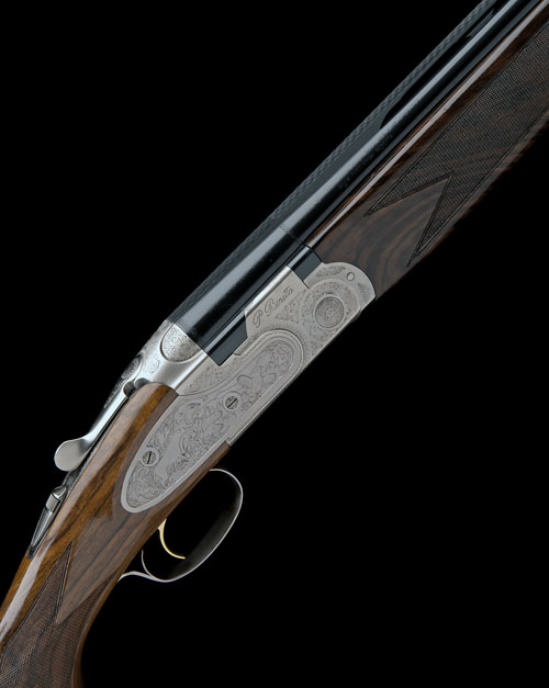 30in. nitro barrels with 9mm ventilated matt top-rib, 3in. chambers, multichokes (one spare), hold-open toplever, manual safety with integral barrel selector switch, gold-washed trigger, foliate scroll engraving, the decorative sideplates carved in relief with scenes of flushed pheasant and partridge, silver finish, 14 1/2in. figured pistolgrip stock including 1/2in. rubber recoil pad, weight 7lb. 12oz., in its makers universal case