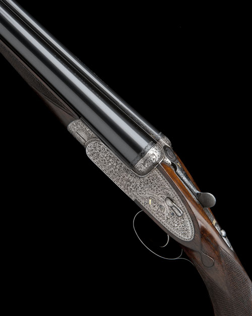 27in. nitro replacement barrels (in 1980), tubes engraved 'HOLLAND & HOLLAND. 13. BRUTON STREET. LONDON.' 2 3/4in. chambers, bored approx. 1/4 and 3/4 choke, toplever gold-inlaid '1', automatic safety with gold-inlaid 'SAFE' detail, hand-detachable lockplates, gold-inlaid cocking-indicators, Holland patent semi-selective single trigger, best bold Royal scroll engraving, bright and blued finish overall, 15 7/8in. semi-pistolgrip stock, weight 7lb. 1oz., in its lightweight leather case