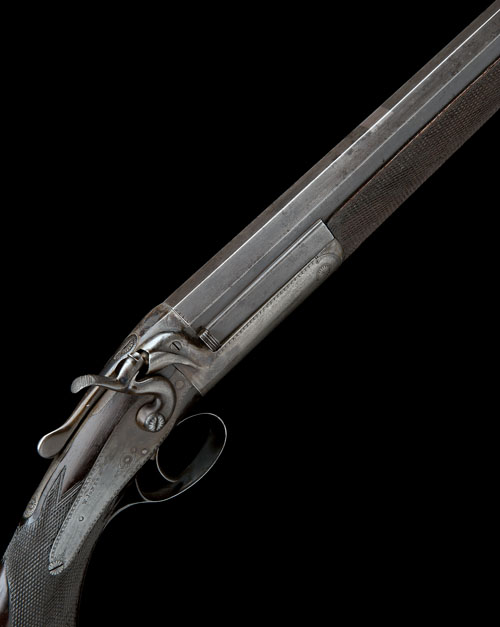 28 3/8in. nitro reproved turned octagonal to round barrel, smoothbored to .410 from .360 rook calibre, 2 1/2in. chamber, bored approx. 1/4 choke, ornately carved percussion fence, rebounding back-action lock, action flat stamped 'PATENT 1885. NO. 15916', border engraving, retaining traces of colour-hardening, 14 1/4in. figured pistolgrip stock with horn pistolgrip-cap, snap fore-end with light horn finial, weight 4lb. 2oz.