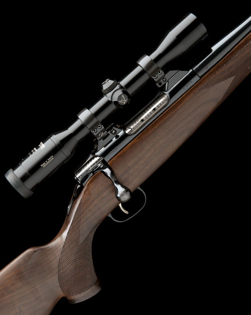 23 3/4in. nitro barrel with open sights and ramp-mounted blade fore-sight, receiver mounted with a Swarovski Habicht 4x32 Nova telescopic sight in quickly-detachable mounts, detachable box magazine, set trigger, figured pistolgrip stock with hogsback comb, sculpted cheekpiece, sling swivels, 14 1/4in. pull including 7/8in. ventilated rubber recoil pad