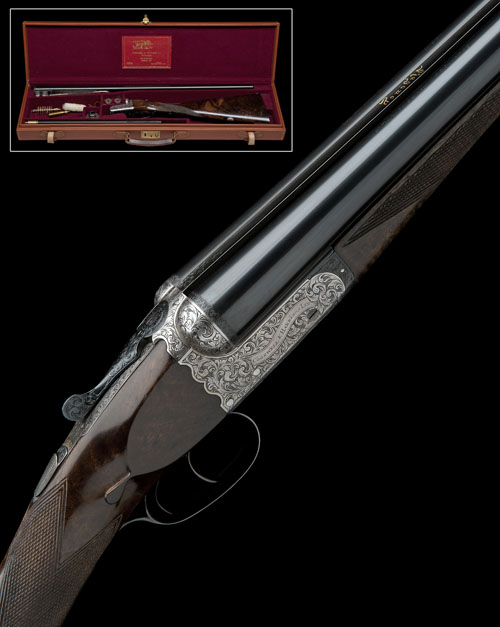 28in. nitro barrels, the rib gold-inlaid 'REGENCY' and the tubes engraved 'COGSWELL & HARRISON LTD. 168. PICCADILLY. LONDON. W.1.' 2 3/4in. chambers, bored approx. 1/4 and 1/2 choke, scroll-back action, automatic safety with gold-inlaid 'SAFE' detail, acanthus scroll engraving, brushed bright and blued finish, 15 1/8in. highly-figured stock including 1 5/8in. well-matched wooden extension, weight 6lb. 5oz., in its makers tan leather case