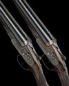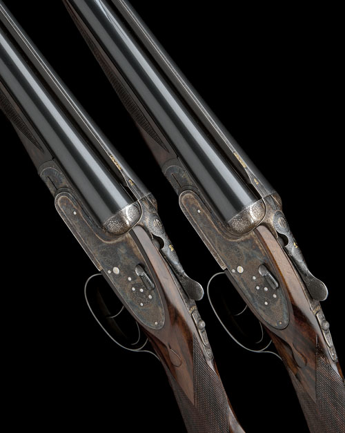 25in. nitro chopperlump barrels, with Churchill-ribs gold-inlaid 'AYA' '1' and '2', 2 3/4in. chambers, bored approx. imp. cyl. and 1/2 choke (both), toplevers gold-inlaid '1' and '2', automatic safeties with gold-inlaid 'SAFE' details, hand detachable sidelocks, gold-inlaid cocking indicators, articulated front triggers, gold-washed internals, rolled-edge triggerguards (left side) bouquet and scroll engraving, retaining much original colour-hardening and finish, 15 1/4in. figured stocks including 1in. rubber recoil pads (No.1 cracked and repaired), weight 6lb. 8oz. (both), in a leather double motorcase with canvas and leather outer