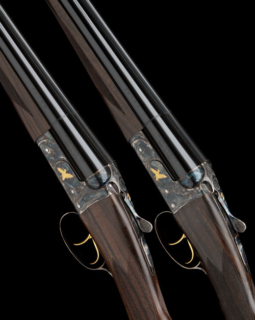 28in. nitro barrels, 3in. chambers, bored approx. imp. cyl. and 1/2 choke (both), manual safeties, gold-washed triggers, the front triggers articulated, actions gold-inlaid with woodcock and partridge, retaining virtually full original cyanide colour-hardening and finish, 14 1/2in. stocks including wooden buttplates, weight 6lb. 3oz. and 6lb. 4oz. respectively, in their makers individual universal cases