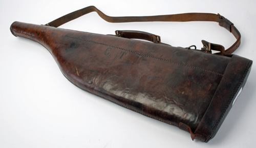 A LEATHER LEG-OF-MUTTON SINGLE GUNCASE, suitable for 29in. barrels, lined with red baize, with the monogram 'C.T.B.'