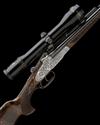 23 3/4in. nitro chopperlump barrels with matt sight-rib, open sights and ramp-mounted bead fore-sight, the breech-end fitted with a Zeiss Diavari-ZM 1,5-6x42 telescopic sight in scroll engraved quick-detachable mounts, bolstered treble-grip action, automatic safety, cocking-indicators, gold-washed triggers, the front a set trigger, best bouquet and scroll engraving with gold highlights, 14 1/2in. highly-figured pistolgrip stock with cheekpiece, engraved steel pistolgrip-cap inlaid in gold with the monogram 'UK', sling swivels, engraved steel skeletal buttplate, weight 9lb. 5oz., in its makers fitted case with canvas outer