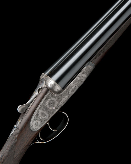 27in. nitro chopperlump barrels, rib gold-inlaid '1' (inscription indistinct), 2 1/2in. chambers, bored approx. true cyl. and full choke, Boss patent full self-opening action with removable striker discs, toplever gold-inlaid '1', automatic safety with gold-inlaid 'SAFE' detail, gold-inlaid cocking-indicators, rolled-edge triggerguard, best fine bouquet and scroll engraving, retaining very slight traces of original colour-hardening, 14in. figured stock, weight 6lb. 1oz.