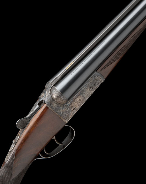 25in. nitro chopperlump barrels with Churchill rib gold-inlaid 'AYA', 2 3/4in. chambers, bored approx. true and imp. cyl., automatic safety with gold-inlaid 'S' detail, removable striker discs, engraved with floral scroll motifs, retaining some original colour-hardening and finish, 14 3/4in. stock, weight 6lb. 3oz., in a wooden box
