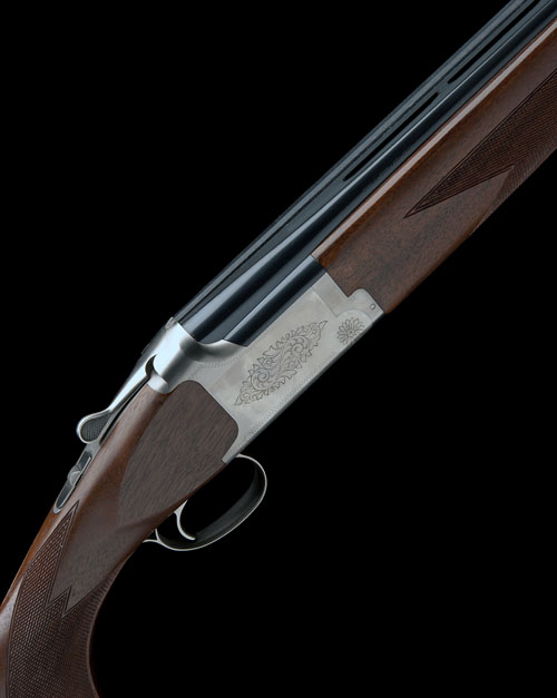 28in. nitro barrels with 13mm ventilated matt top-rib, 2 3/4in. chambers, bored approx. 1/4 and 3/4 choke, hold-open toplever, manual safety with integral barrel selector switch, border and partial scroll engraving, silver finish, 14 1/2in. pistolgrip stock, weight 7lb. 4oz., in its makers carton