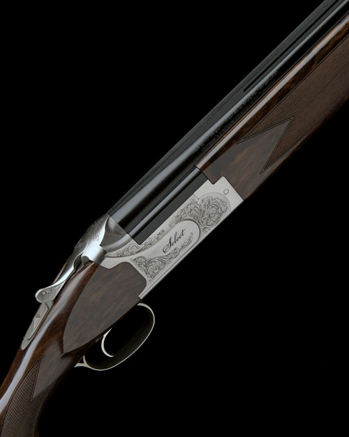 30in. nitro barrels with ventilated mid rib and 10mm ventilated matt top-rib, 3in. chambers, multichokes (one spare), hold-open toplever, manual safety with integral barrel selector switch, adjustable single-trigger, partial acanthus scroll engraving, silver finish, 14 1/2in. figured pistolgrip stock including 3/4in. rubber recoil pad, weight 7lb. 6oz., in its makers red universal case