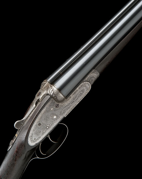 28in. nitro replacement barrels by another, 2 1/2in. chambers, bored approx. true cyl. and 3/4 choke, carved leaf fences, automatic safety with gold-inlaid 'SAFE' detail, fine bouquet and acanthus scroll engraving, retaining very slight traces of original colour-hardening, 14 1/2in. figured stock including wooden buttplate, weight 6lb. 11oz.