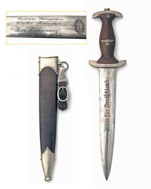 circa 1935, with double edged 8 3/4in. blade (cleaned), etched with the motto ' ALLES FUR DEUTSCHLAND' (everything for Germany), makers mark to the reverse together with an engraved inscription 'UNSEREM STURMFUHRER WALTER SCHLEICHER ZUR ERINNERUNG AN STURM 51/138 27.1.35', (Our Sturmfuhrer Walter Schleicher in memory of Sturm 51/138 of 27.1.35), stained wood grip (some minor hairline cracks to top and base) inlaid with an eagle and swastika and the 'SA' roundel to top of hilt, solid nickel fittings with area stamp 'Nrh' (Neiderrhein), TOGETHER WITH its original brown metal scabbard with nickel chape and throat complete with its short leather hanger (some mild staining to blade and dents to scabbard)