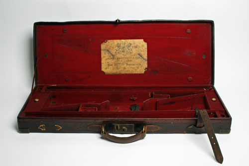 suitable for 29in. barrels, lined with red baize, brass lock key missing, the interior lid with a 'JAMES WOODWARD & SONS' trade label