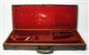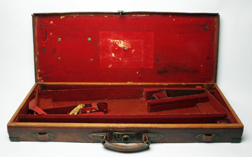 suitable for 30in. barrels, lined with maroon baize, brass lock (key missing), interior trade label missing, ther exterior lid with a brass escutcheon
