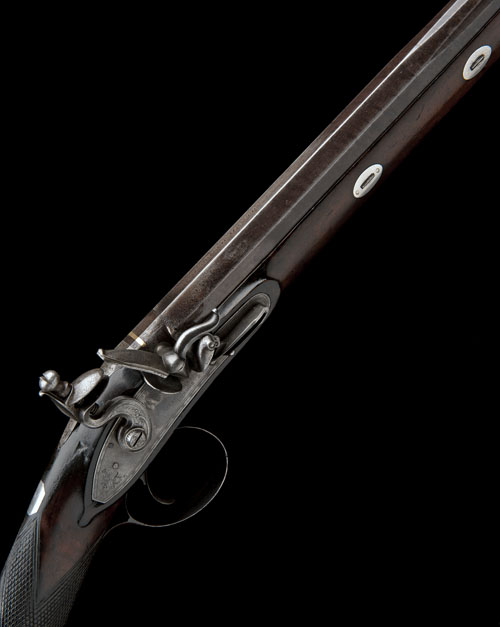 circa 1804, with triple-stage 30in. barrel, carved band at the beginning of the round section, the top-flat signed 'JOSEPH MANTON', applied silver fore-sight, gold line to the hooked breech, platinum touch-hole, border and scroll engraved top-tang, flat, curved lockplate with border engraving and a musical trophy to the tail, signed 'JOSEPH MANTON, LONDON' forwards of the hammer, re-faced roller-frizzen engraved on the front edge 'JOSEPH MANTON' and 'PATENT 1121', rainproof pan, walnut half-stock chequered at the wrist, clipped-corner silver rectangular escutcheon behind top-tang, iron furniture, oversized trigger guard bow engraved with a martial trophy, pineapple finial, two take-down wedges with silver escutcheons, horn fore-end tip and original ramrod