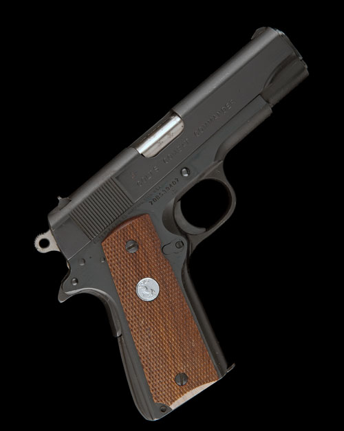 for 1978, with 4in. barrel, blued slide with model and calibre details, blued frame with matted grip-straps, grip-safety, ring-hammer and chequered walnut grips with inlayed 'Colt' medallions, the whole appearing little used