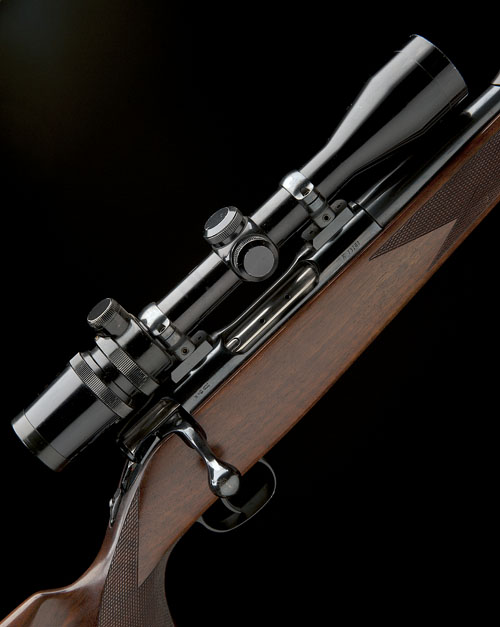 24in. nitro barrel with block-mounted open sights and ramp-mounted bead fore-sight, the receiver mounted with a Hakko Electro Point Mark VIII Bisley Deluxe telescopic sight, detachable magazine, blued finish, set trigger, figured pistolgrip stock with dark wood finial and pistolgrip-cap, hogsback comb, cheekpiece, sling swivels, 14 3/8in. pull including 1in. ventilated rubber recoil pad