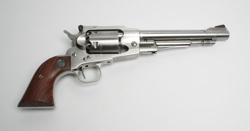 A REPRODUCTION .44 PERCUSSION SIX-SHOT REVOLVER SIGNED RUGER, MODEL 'OLD ARMY', serial no. 145-85172, with stainless-steel 7 1/2in. barrel, adjustable sights, solid stainless frame and smooth wood grips, complete with its manufacturers plastic carry case
