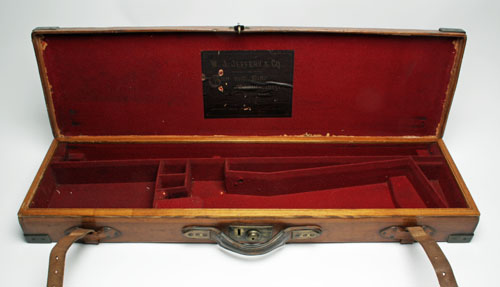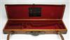 fitted for 30in. barrels, lined with maroon baize, brass lock (key missing), the interior lid with a 'W.J. JEFFERY & CO.' trade label,